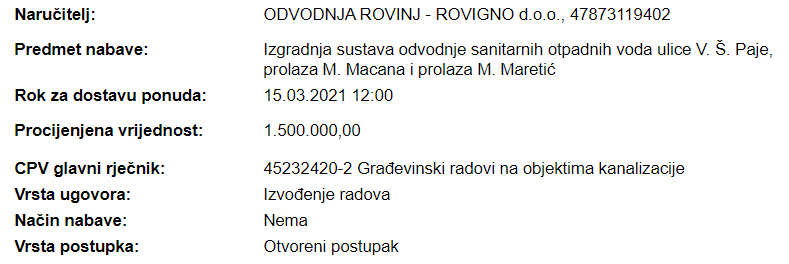 Na internetskim stranica Elektroničkog oglasnika javne nabave RH objavljen je javni natječaj za izgradnju sustava odvodnje sanitarnih otpadnih voda ulice V. Š. Paje, M. Macana i M. Maretić. Sveukupna procijenjena vrijednost nabave iznosi 1.500.000,00 kuna (bez PDV-a), a rok za dostavu ponuda je 15.03.2021.g. do 12:00h. Poveznica na Elektronički oglas : https://eojn.nn.hr/Oglasnik/ .