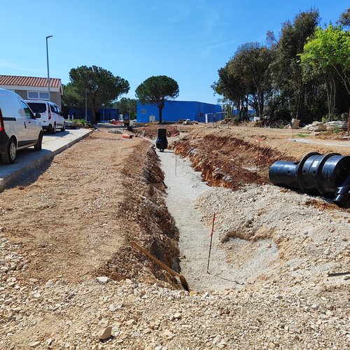 Inoltre, all’inizio di aprile e all’inizio di maggio sono stati svolti prevalentemente i lavori al verde urbano, e sono state posate le superfici erbose presso il laboratorio e l’edificio amministrativo. Una parte del fossato per la posa delle tubature idriche sulla strada è stato riempito con materiale pietrisco. È in corso la posa delle fondazioni e il montaggio delle tubature per lo scarico delle acque meteoriche nella zona di fronte al garage per i veicoli speciali. Nella zona prevista per il parcheggio dei dipendenti della Depurazione acque Rovinj – Rovigno s.r.l. è stato posato il sottofondo, mentre all’edificio amministrativo è in corso l’installazione degli infissi (porte) per preparare tutto prima del prossimo arrivo dei dipendenti.
