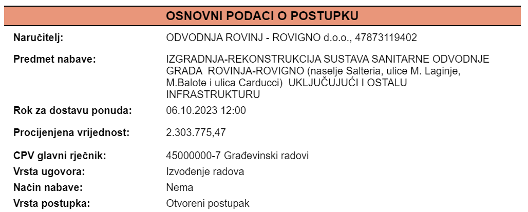 JAVNA NABAVA "IZGRADNJA-REKONSTRUKCIJA SUSTAVA SANITARNE ODVODNJE GRADA ROVINJA-ROVIGNO (naselje Salteria, ulice M.Laginje, M.Balote i ulica Carducci) UKLJUČUJUĆI I OSTALU INFRASTRUKTURU" 06 Settembre 2023