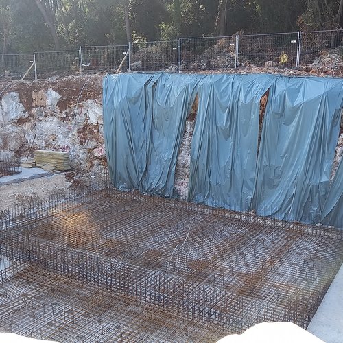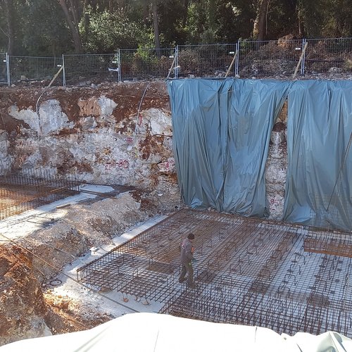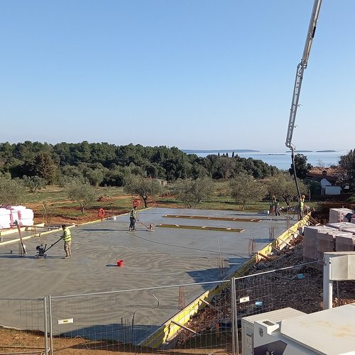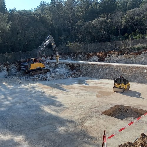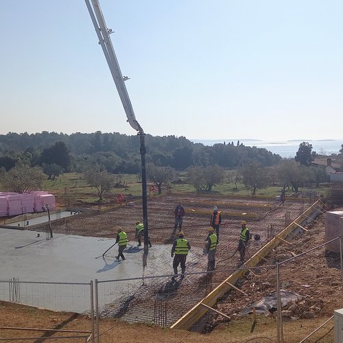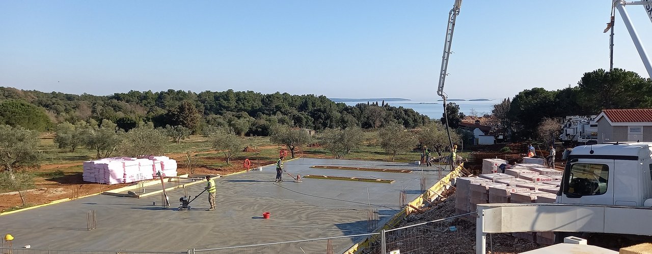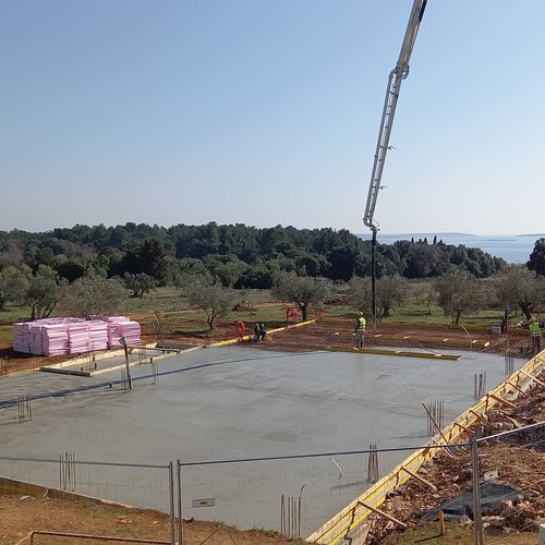 i lavori di preparazione della platea per le fondamenta in parte dei futuri bacini di fitodepurazione mentre al garage per i veicoli pesanti è stata portata a termine la posa del calcestruzzo per le fondamenta nonché la rasatura con la lisciatrice.