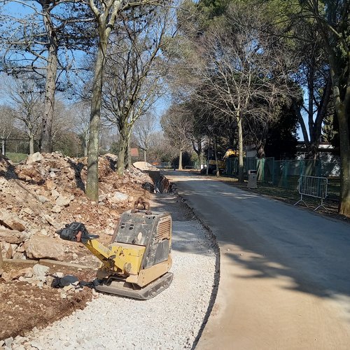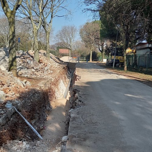 I lavori di scavo, la posa della condotta in pressione per l’irrigazione con l’acqua depurata e il riempimento degli scavi sono stati effettuati nel villaggio turistico Villas Rubin fino al confine con il camping Polari. Finora è stato installato in totale il 65 % della condotta in pressione.