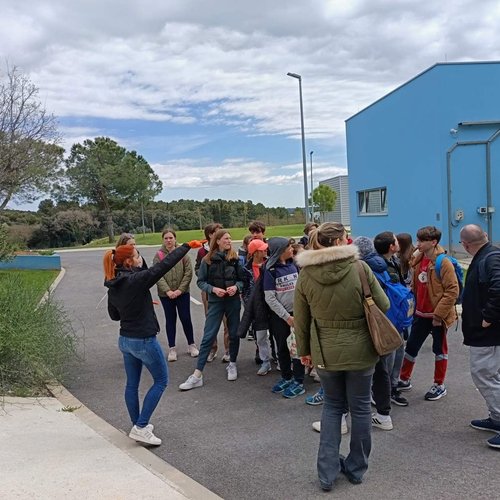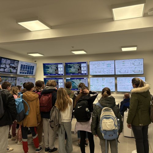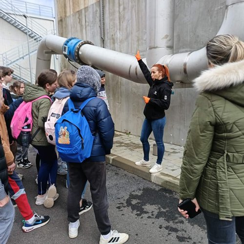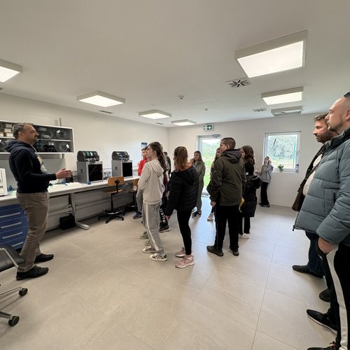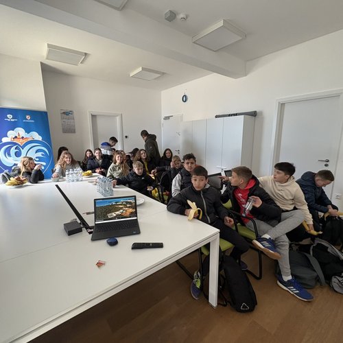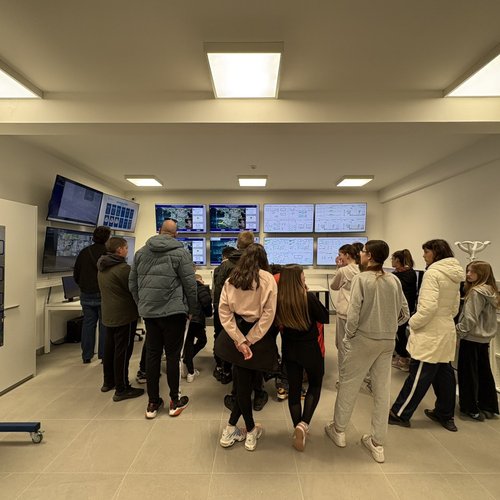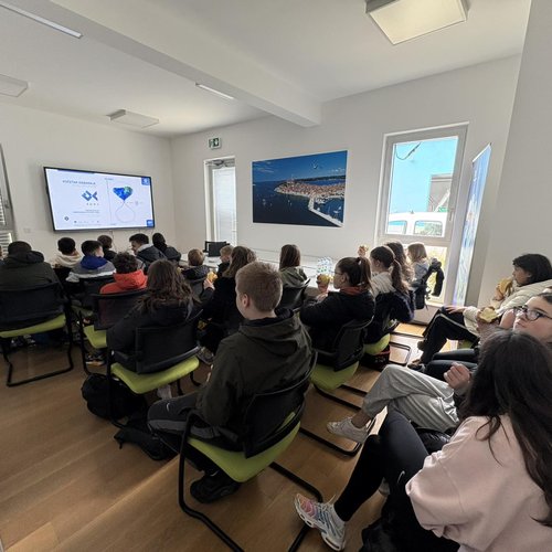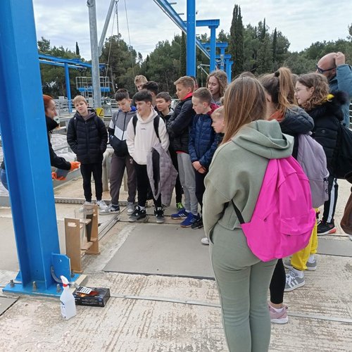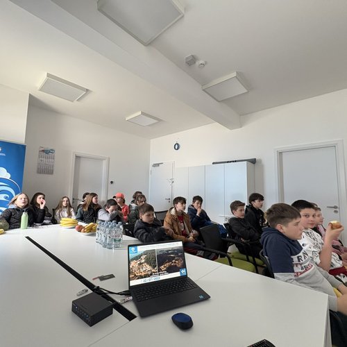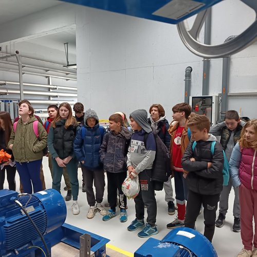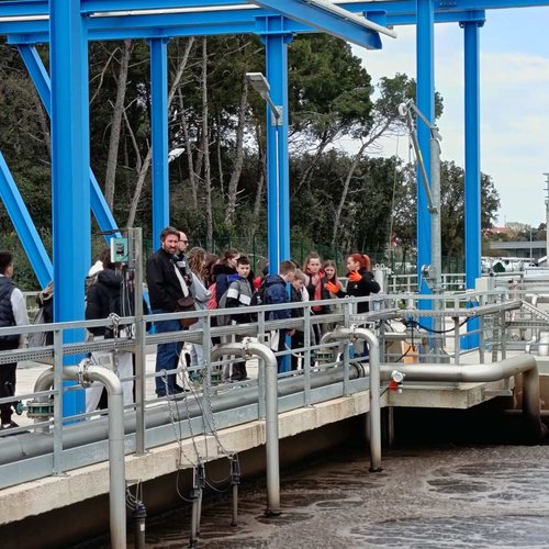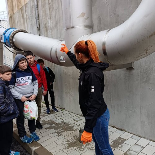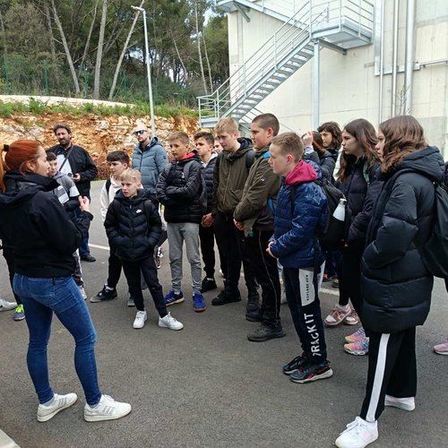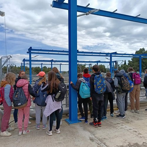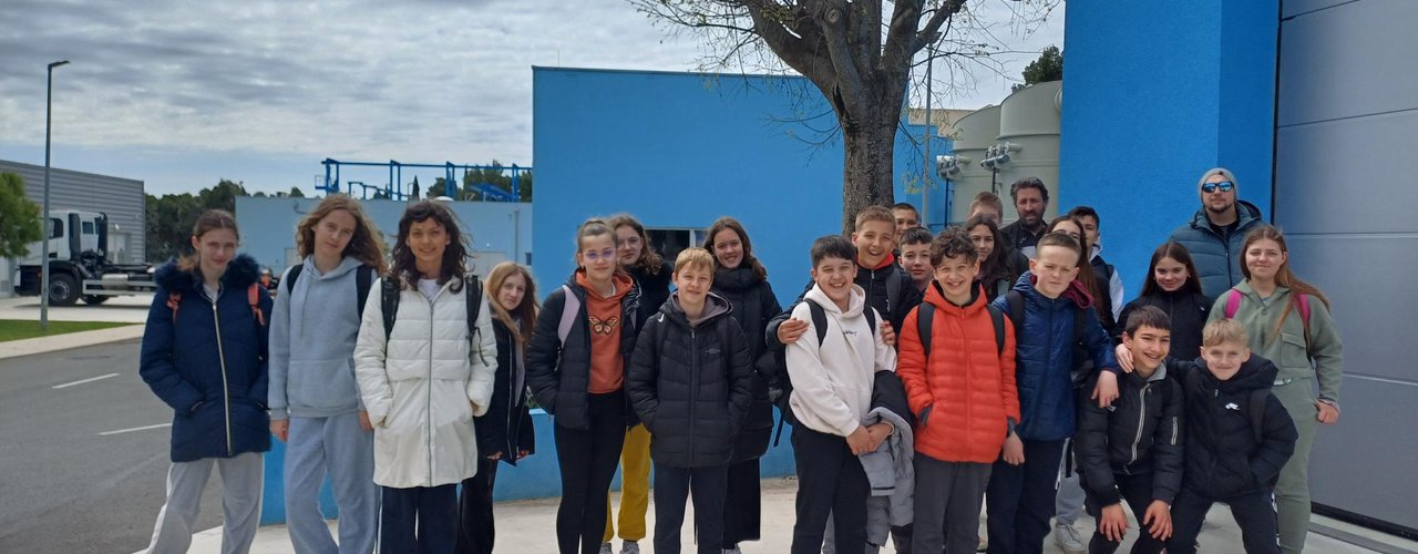 Oltre alla visita all’IDAR Cuvi, accompagnati dal Direttore della scuola Bojan Burić, dall’insegnante di biologia Petar Lajoš, dall'insegnante di lingua croata Dubravka Burić e dall'insegnante di cultura artistica Toni Žufić, gli alunni hanno avuto l’opportunità di vedere le acque reflue in entrata e in uscita, la sabbia separata, i fanghi disidratati (20% di sostanza secca), i fanghi essiccati (90% di sostanza secca), e non solo di osservarli da vicino, ma anche di toccarli, cosa che per loro è stata particolarmente interessante. Inoltre, presso l’edificio di biologia e ultrafiltrazione, è stato loro presentato il processo di trattamento delle acque reflue ed è stato mostrato loro un esempio di membrana e il processo di sedimentazione dei fanghi dal bioreattore. Nell’edificio dell’amministrazione è stato proiettato un documentario sulla costruzione dell’IDAR Cuvi e dell’impianto per l’essiccamento solare dei fanghi. In tale occasione, in relazione al tema della visita, è stato sottolineato che nell’ambito del progetto sono state implementate le necessarie procedure e misure di tutela ambientale. Il tour è proseguito con la visita alla sala di gestione e controllo dell’IDAR Cuvi, alla rete fognaria e all’IDAR di Valle, nonché alla sala con le stampanti 3D.