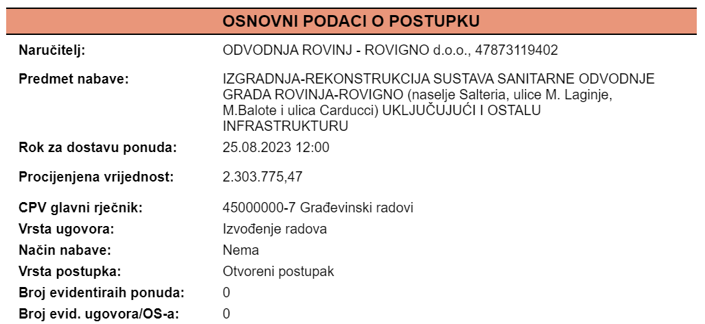Objavljen javni natječaj za Izgradnju - rekonstrukciju sustava sanitarne odvodnje grada Rovinja - Rovigno (naselje Salteria, ulice M.Laginje, M.Balote i ulice Carducci) uključujući i ostalu infrastrukturu 24 Luglio 2023